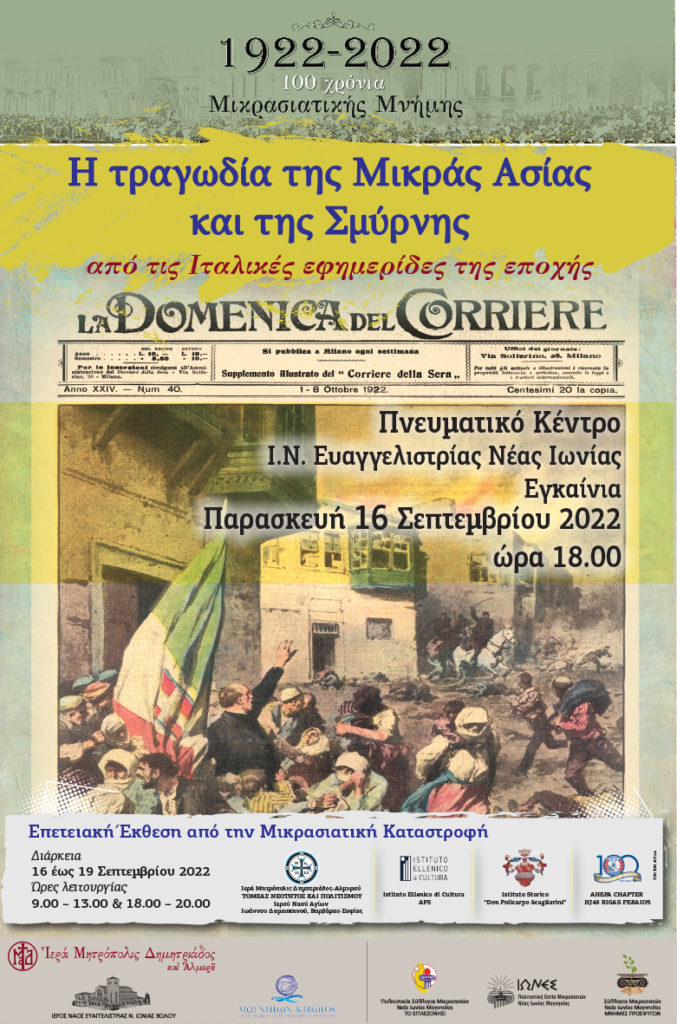 Με αφορμή τη συμπλήρωση 100 χρόνων από τη Μικρασιατική Καταστροφή, ο Τομέας Νεότητος και Πολιτισμού του Ιερού Ναού Αγίων Ιωάννου Δαμασκηνού, Βαρβάρας και Σοφίας, Νέας Ιωνίας διοργανώνει και το Istituto Ellenico di Cultura – Ελληνικό Ινστιτούτο Πολιτισμού του Μιλάνου, προγραμματίζουν, από κοινού, μια επετειακή έκθεση που θα εγκαινιαστεί επίσημα στις 21 Σεπτέμβριο του 2022.