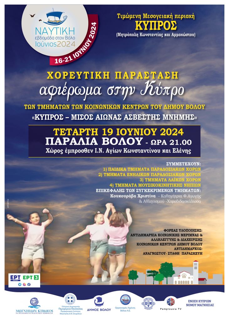Ακόμα στις 9.00 μ.μ στην Παραλία Βόλου, έμπροσθεν του Ιερού Ναού Αγίων Κωνσταντίνου και Ελένης, θα πραγματοποιηθεί ΧΟΡΕΥΤΙΚΗ ΠΑΡΑΣΤΑΣΗ – ΑΦΙΕΡΩΜΑ ΣΤΗΝ ΚΥΠΡΟ με τίτλο: «ΚΥΠΡΟΣ – ΜΙΣΟΣ ΑΙΩΝΑΣ ΑΣΒΕΣΤΗΣ ΜΝΗΜΗΣ» των τμημάτων των Κοινωνικών Κέντρων του Δήμου Βόλου. Φορέας Υλοποίησης είναι η ΑΝΤΙΔΗΜΑΡΧΙΑ ΚΟΙΝΩΝΙΚΗΣ ΜΕΡΙΜΝΑΣ ΚΑΙ ΑΛΛΗΛΕΓΓΥΗΣ ΚΑΙ ΔΙΑΧΕΙΡΙΣΗΣ ΚΟΙΝΩΝΙΚΩΝ ΚΕΝΤΡΩΝ ΔΗΜΟΥ ΒΟΛΟΥ με υπεύθυνη Αντιδήμαρχο την κ. Παρασκευή Αναγνώστου – Στάθη.