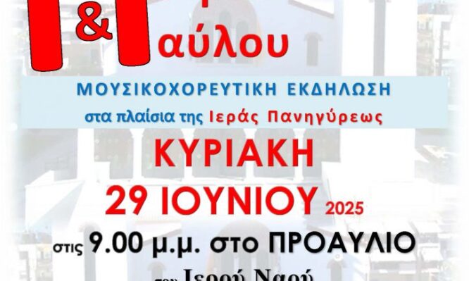 Ακολούθως, στις 9.00 μ.μ. θα πραγματοποιηθεί στον προαύλιο χώρο του Ιερού Ναού Αγίων Αποστόλων Πέτρου & Παύλου Ν. Ιωνίας, ένα πρωτότυπο Λαϊκό Πανηγύρι. Την εκδήλωση θα πλαισιώσουν το Χορευτικό Τμήμα της Τοπικής μας Εκκλησίας και ο Πολιτιστικός και Αθλητικός Σύλλογος “Η Νέα Αγχίαλος”. Θα επακολουθήσει Λαϊκό γλέντι, όπου θα χορέψουν όλοι και θα διασκεδάσουν για να νοιώσουν το μεγαλείο της παράδοσης.