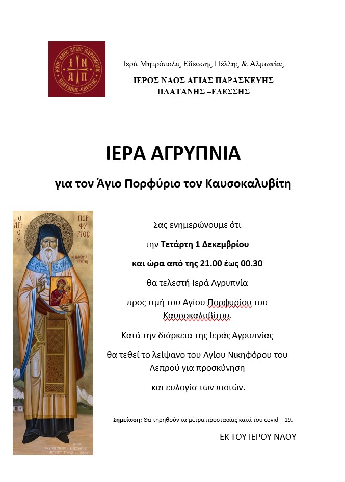 Την παραμονή της εορτής του Αγίου Πορφυρίου, ην Τετάρτη ο1 Δεκεμβρίου, από ώρα 21.00 έως 00.30, στον Ιερό Ναό Αγίας Παρασκευής Πλατάνης Εδέσσης θα τελεσθεί ιερά Αγρυπνία για την μνήμη του Οσίου Πορφυρίου του Καυσοκαλυβίτου.