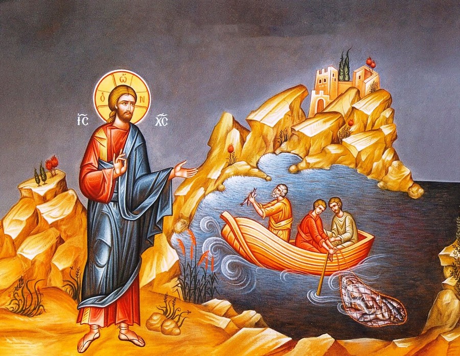 Περπατώντας ὁ Χριστός στήν θάλασσα τῆς Γαλιλαίας εἶδε δύο ἀδέρφια, τόν Σίμωνα, πού κατόπιν τόν ὀνόμασε Πέτρο, καί τόν Ἀνδρέα νά ρίχνουν τά δίχτυα τους στήν θάλασσα, καθώς ἦταν ψαράδες. Τούς κάλεσε νά Τόν ἀκολουθήσουν λέγοντάς τους ὅτι θά τούς κάνει «ψαράδες» ἀνθρώπων. Αὐτοί ἀμέσως ἄφησαν τά δίχτυα τους καί Τόν ἀκολούθησαν. Προχωρώντας λίγο παρακάτω συνάντησε ἄλλα δύο ἀδέλφια, τόν Ἰάκωβο καί τόν Ἰωάννη, τούς γιούς τοῦ Ζεβεδαίου, να βρίσκονται στό καράβι τους μαζί μέ τόν πατέρα τους καί νά ἑτοιμάζουν τά δίχτυα τους, καί τούς κάλεσε καί αὐτούς. Αὐτοί ἀμέσως ἄφησαν τό πλοῖο καί τόν ἀκολούθησαν. Περιόδευσε ὅλη τήν Γαλιλαία διδάσκοντας στίς συναγωγές, κηρύττοντας τό Εὐαγγέλιο τῆς Βασιλείας, θεραπεύοντας κάθε νόσο καί κάθε ἀσθένεια στόν λαό.