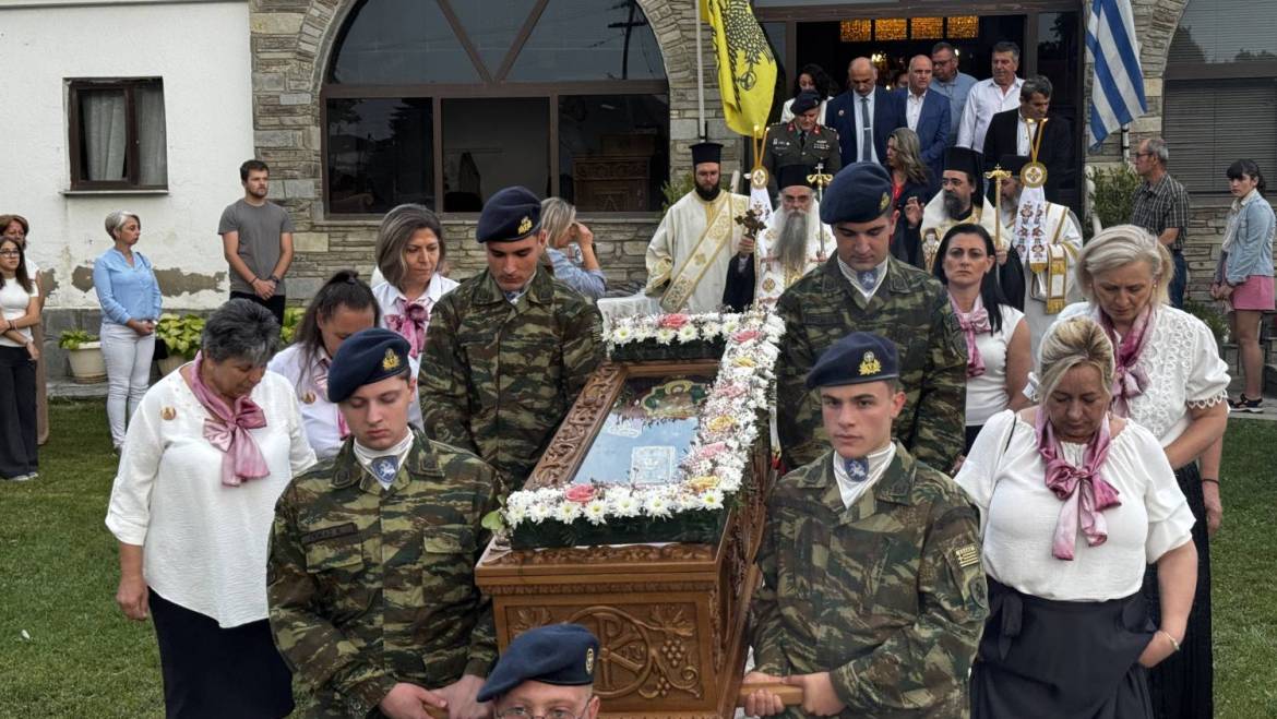 Στὸ τέλος τοῦ πανηγυρικοῦ ἑσπερινοῦ, σχηματίσθηκε πομπὴ καὶ πραγματοποιήθηκε ἡ ἱερὰ Λιτανεία τῆς εἰκόνος καὶ τῶν ἱερῶν λειψάνων τοῦ ἁγίου Ἱερομάρτυρος, τό ὁποῖο μετέφεραν 4 δόκιμοι ἀξιωματικοί τοῦ στρατοῦ, στοὺς κεντρικοὺς δρόμους τοῦ χωριοῦ, μὲ τὴ συμμετοχὴ τῆς Δημοτικῆς Φιλαρμονικῆς Μουσικῆς τοῦ Δήμου Καστοριάς, ἀγήματος γυναικῶν τοῦ Φιλοπτώχου τῆς Ἐνορίας μὲ παραδοσιακὲς φορεσιές, τῶν ἱεροψαλτῶν, τῶν ἱεροπαίδων καὶ τῶν ἱερέων, τοῦ Σεβασμιωτάτου, τῶν Ἀρχῶν τῆς πόλεως καὶ τῶν πιστῶν.
