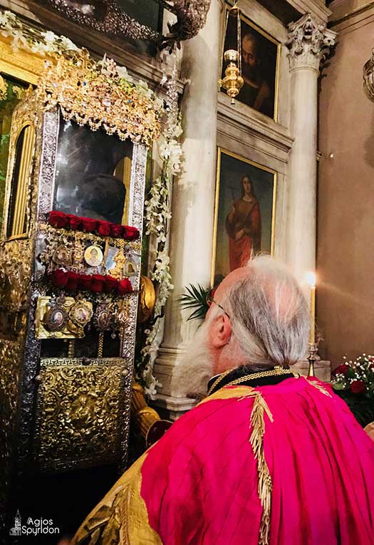 Στην Παράκληση για τον Άγιο Σπυρίδωνα χοροστάτησε ο Σεβασμιώτατος Μητροπολίτης Κερκύρας, Παξών και Διαποντίων Νήσων κ. Νεκτάριος, ο οποίος στον σύντομο λόγο του υπογράμμισε ότι οι καρδιές των πιστών είναι πεπληρωμένες όταν ατενίζουν τον Άγιο και Θαυματουργό Σπυρίδωνα ευρισκόμενο εις την θύρα, ιδιαιτέρως αυτό το τριήμερο όπου η Αγία μας Εκκλησία τιμά την μνήμη του. Όλο το νησί χαίρεται και αγάλλεται, μαζί με ολόκληρη την Χριστιανοσύνη.
