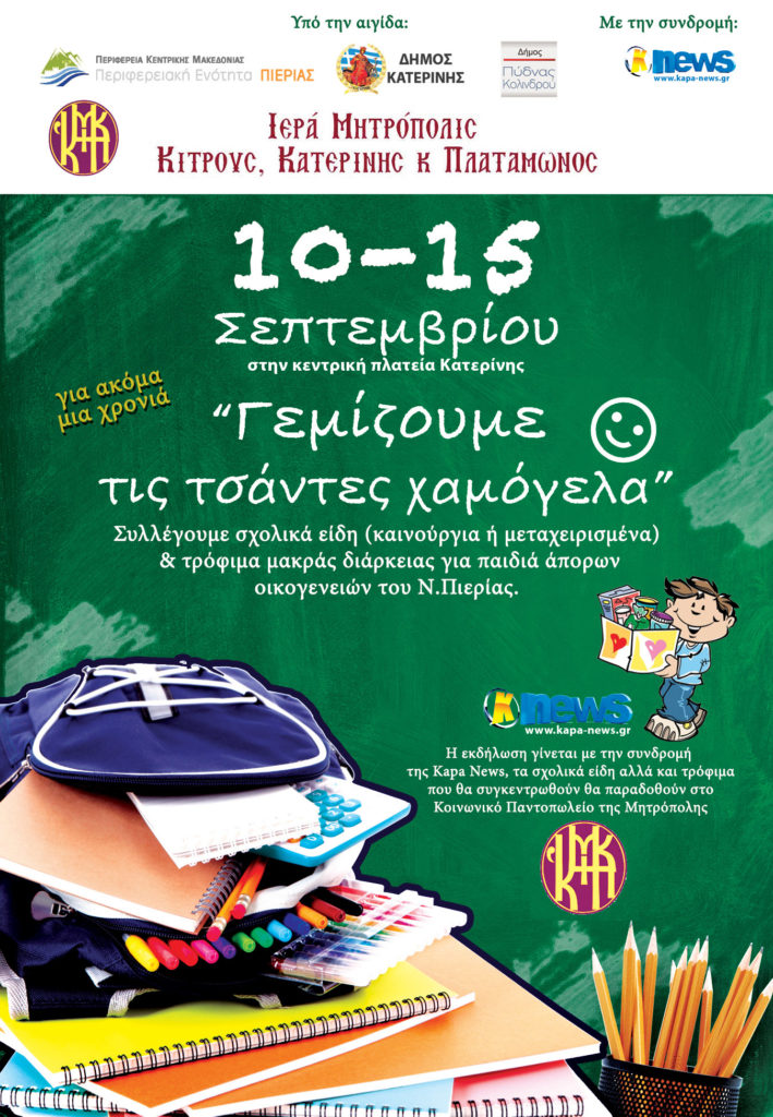 Από τη Δευτέρα 10 Σεπτεμβρίου έως και το Σάββατο 15 Σεπτεμβρίου 2018 θα συγκεντρώνονται σε ειδικά διαμορφωμένο περίπτερο στην κεντρική Πλατεία Κατερίνης, κατά τη διάρκεια του ωραρίου των εμπορικών καταστημάτων, σχολικά είδη και τρόφιμα μακράς διαρκείας προκειμένου να στηριχτούν οικογένειες με παιδιά σχολικής ηλικίας, οι οποίες δυσκολεύονται να ανταπεξέλθουν στις απαιτήσεις της νέας σχολικής χρονιάς. Από την πρώτη ημέρα λειτουργίας του μέχρι σήμερα το Εκκλησιαστικό Κοινωνικό Παντοπωλείο της Ιεράς Μητροπόλεως Κίτρους μέσω και των Ενοριακών παραρτημάτων του υποστηρίζει εκατοντάδες άπορες οικογένειες της Πιερίας, αριθμός που αυξάνει καθημερινά και ραγδαία. Απώτερος σκοπός της δράσης αυτής που πραγματοποιείται με την ευλογία και πατρική μέριμνα του Σεβασμιωτάτου Μητροπολίτη Κίτρους κ. Γεωργίου είναι η ανακούφιση των παιδιών και των γονέων τους από πιεστικά προβλήματα της καθημερινότητας, όπως τα απαιτούμενα προϊόντα και αγαθά για τη καινούργια σχολική χρονιά, προκειμένου να διασφαλιστεί η απαιτούμενη ποιότητα της ζωής που τη δικαιούνται όλοι.
