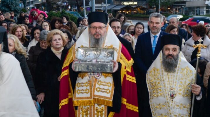 Το Ιερό Λείψανο εκόμισε στη Λάρισα ο Θεοφιλέστατος Επίσκοπος Σκιάθου κ. Ιωάννης, Αρχιγραμματεύς της Ιεράς Συνόδου της Εκκλησίας της Ελλάδος, ενώ το υπεδεχθη ο Σεβασμιώτατος Μητροπολίτης Λαρίσης και Τυρνάβου κ. Ιερώνυμος. Προπορευομένης της Φιλαρμονικής του Ιερού Ναού Αγ. Γεωργίου Μεγαλομάρτυρος, οδ. Βόλου, της Ιεράς Μητροπόλεως Λαρίσης και Τυρνάβου, των Εξαπτέρυγων, λαμπάδων και του Ιερού Κλήρου, το Ιερό Λείψανο μετεκομίσθη στον Ιερο Ναό, ενώ ακολουθούσε το Χριστεπώνυμο πλήρωμα.
