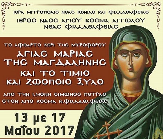 ΤΕΤΑΡΤΗ 17 Μαΐου : 7-10 π.μ. ΟΡΘΡΟΣ- ΘΕΙΑ ΛΕΙΤΟΥΡΓΙΑ 12 ΧΑΙΡΕΤΙΣΜΟΙ ΑΓΙΑΣ ΜΑΡΙΑΣ ΤΗΣ ΜΑΓΔΑΛΗΝΗΣ 6 μ.μ.ΔΕΗΣΗ- ΑΝΑΧΩΡΗΣΗ ΙΕΡΩΝ ΣΕΒΑΣΜΑΤΩΝ