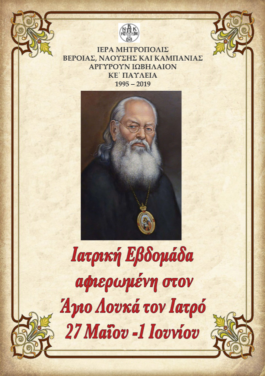 Ιατρική Εβδομάδα, αφιερωμένη στον Άγιο Λουκά τον Ιατρό διοργανώνει από τις 27 Μαΐου έως τις 31 Μαΐου 2019, η Μητρόπολη Βεροίας σε συνεργασία με φορείς της περιοχής.