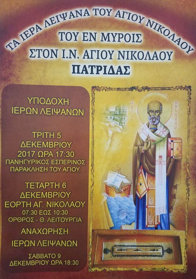 Υποδοχή των Ιερών Λειψάνων του Αγίου Νικολάου του εν Μύροις θα πραγματοποιηθεί στον πανηγυρίζοντα ομώνυμο Ναό στην Πατρίδα Βέροιας προς αγιασμό των πιστών. Επί τη Εορτή του Αγίου Νικολάου
