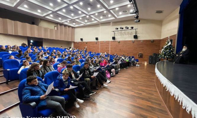 Στην αίθουσα του Μητροπολιτικού Κέντρου είχαν την ευκαιρία να παρακολουθήσουν μικρό βίντεο για τους Αγίους Ναουσαίους Νεομάρτυρες, μετά το πέρας του οποίου έψαλλαν ύμνους και τραγούδια στον Σεπτό Ποιμενάρχη και απήλαυσαν την αβραμιαία φιλοξενία της ενορίας της Παναγίας με την φροντίδα του προϊσταμένου του Ιερού Ναού και Γραμματέα της Ιεράς Μητροπόλεως μας Αρχιμ. Αρσενίου Χαλδαιοπούλου και των συνεργατών του.