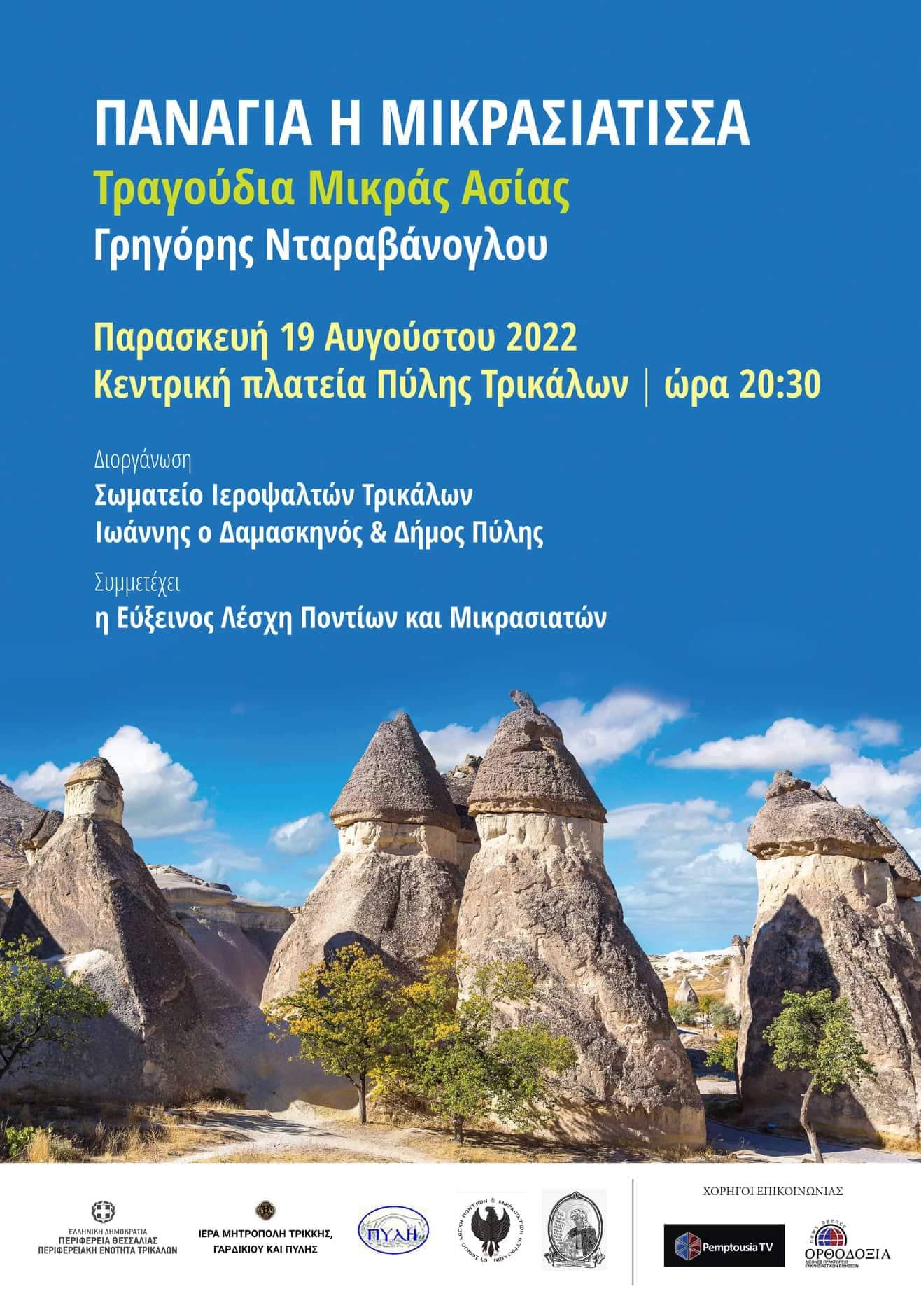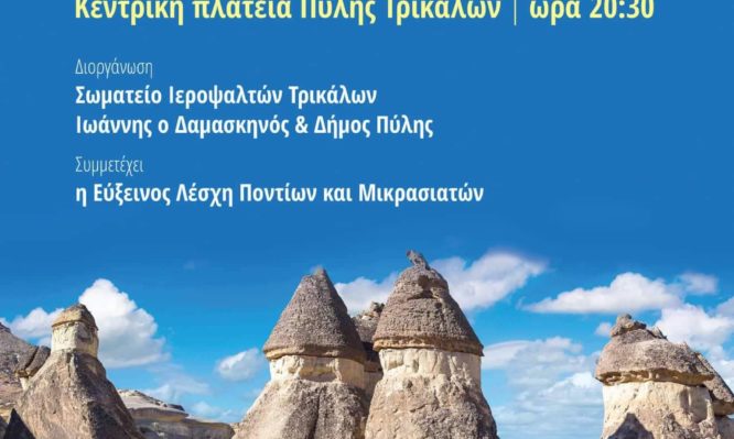 Το Σωματείο Ιεροψαλτών Τρικάλων Ιωάννης ο Δαμασκηνός και ο Δήμος Πύλης σας προσκαλούν στη μουσική εκδήλωση που θα γίνει την Παρασκευή 19 Αυγούστου στις 8:30 το βράδυ στην κεντρική πλατεία της Πύλης.