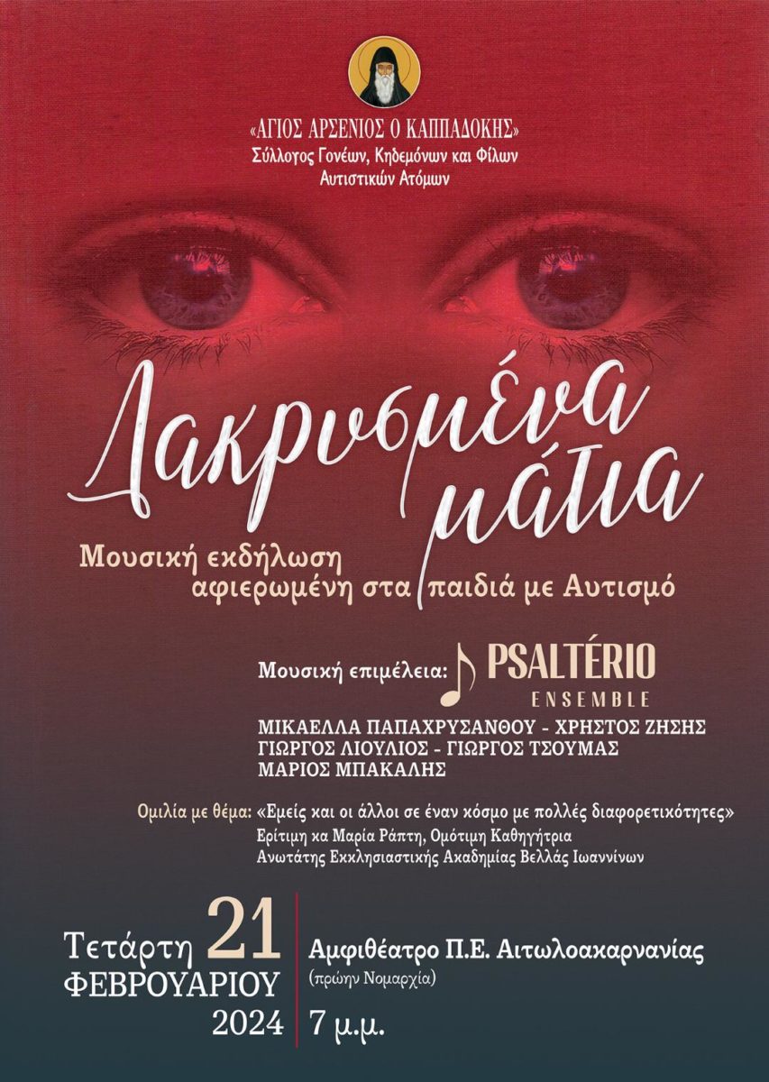 Ο Σύλλογος Γονέων, Κηδεμόνων και Φίλων Αυτιστικών Ατόμων ΑΓΙΟΣ ΑΡΣΕΝΙΟΣ Ο ΚΑΠΠΑΔΟΚΗΣ διοργανώνει μουσική εκδήλωση με τίτλο «Δακρυσμένα Μάτια» αφιερωμένη στα παιδιά με αυτισμό.Η εκδήλωση θα πραγματοποιηθεί την Τετάρτη 21 Φεβρουαρίου 2024 και ώρα 19:00’ στην Ιερά Πόλη του Μεσολογγίου, στο Αμφιθέατρο της Περιφερειακής Ενότητος Αιτωλοακαρνανίας (πρώην Νομαρχία).Θα περιλαμβάνει ομιλία από την Ομότιμη Καθηγήτρια της Ανωτάτης Εκκλησιαστικής Ακαδημίας Βελλάς Ιωαννίνων, Ελλογιμωτάτη κα Μαρία Ράπτη, με θέμα: «Εμείς και οι άλλοι σε έναν κόσμο με πολλές διαφορετικότητες» και συναυλία από το μουσικό σχήμα Psaltério Ensemble