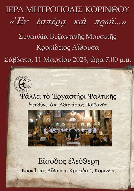 Γίνεται γνωστό ότι η Ι. Μητρόπολις Κορίνθου διοργανώνει Συναυλία Βυζαντινής Μουσικής το Σάββατο, 11 Μαρτίου 2023 και ώρα 19.00’, στην «ΚΡΟΚΙΔΕΙΟ ΑΙΘΟΥΣΑ» στην Κόρινθο με τον τίτλο: «Ἐν ἑσπέρᾳ καί πρωΐ…». Θα ψάλει η Χορωδία «ΕΡΓΑΣΤΗΡΙ ΨΑΛΤΙΚΗΣ» που διευθύνει ο κ. Αθανάσιος Παϊβανάς.