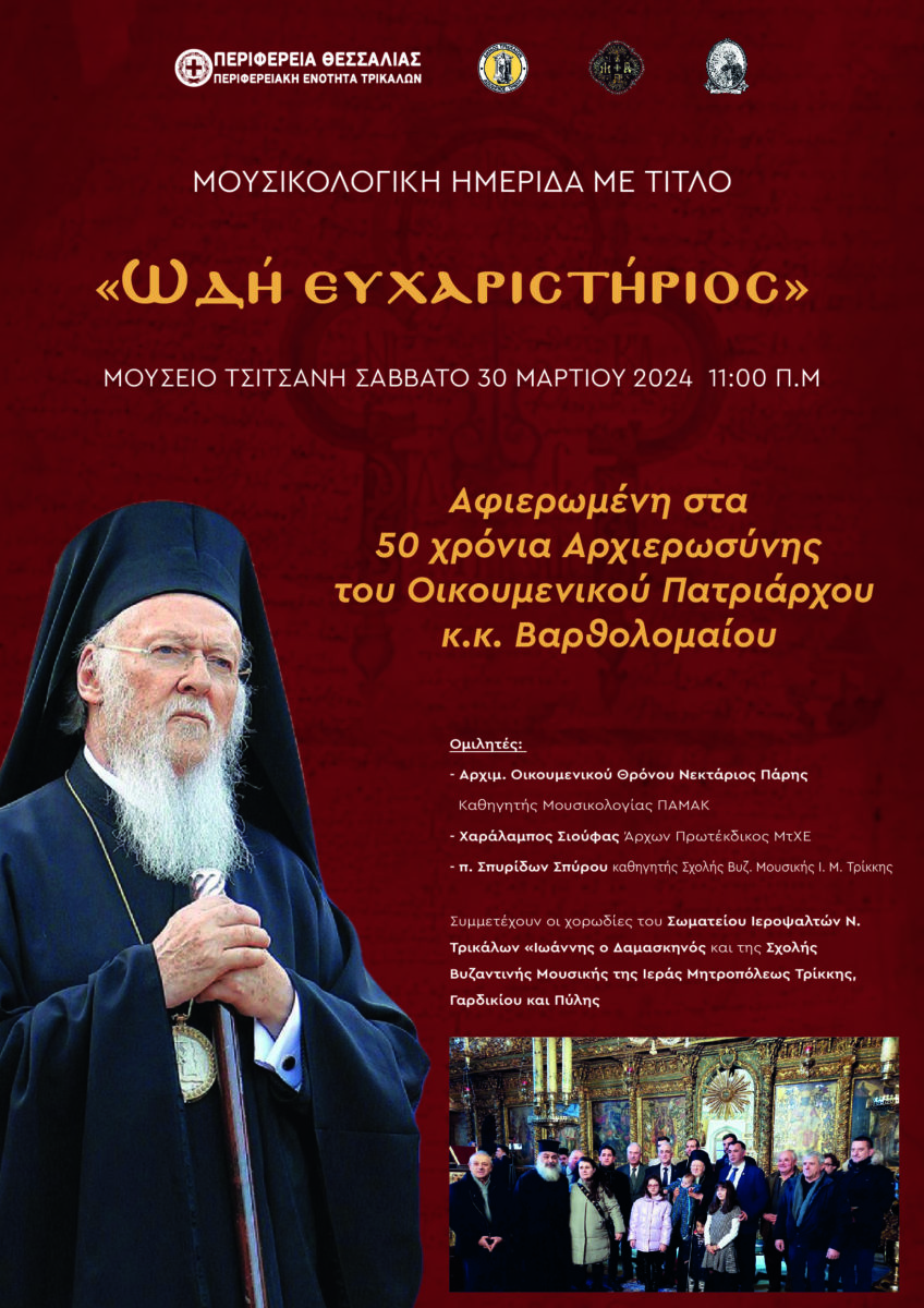 Μουσικολογική ημερίδα με τίτλο «Ωδή Ευχαριστήριος» και αφιερωμένη στα 50 χρόνια αρχιεροσύνης του Οικουμενικού Πατριάρχη κ. Βαρθολομαίου διεξάγεται το Σάββατο 30 Μαρτίου 2024 στο Μουσείο Τσιτσάνη.