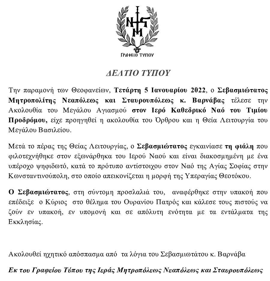 Στην υπακοή που επέδειξε ο Κύριος στο θέλημα του Ουρανίου Πατρός, μεταξύ άλλων, αναφέρθηκε ο Σεβ. Μητροπολίτης Νεαπόλεως και Σταυρουπόλεως κ. Βαρνάβας, σήμερα, Τετάρτη, 5 Ιανουαρίου 2022, στο σύντομο κήρυγμά του, από τον Ι. Καθεδρικό Ναό του Τιμίου Προδρόμου.