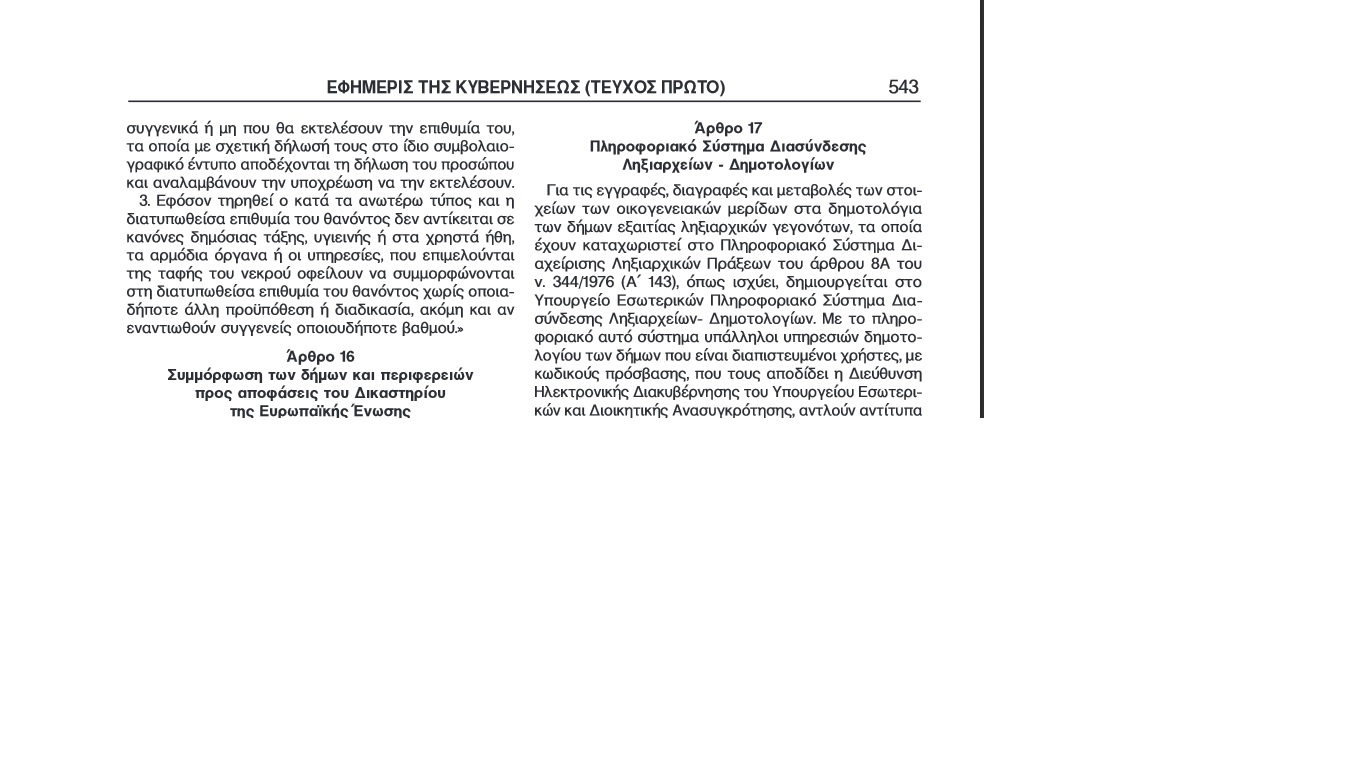 3. Εφόσον τηρηθεί ο κατά τα ανωτέρω τύπος και η διατυπωθείσα επιθυμία του θανόντος δεν αντίκειται σε κανόνες δημόσιας τάξης, υγιεινής ή στα χρηστά ήθη, τα αρμόδια όργανα ή οι υπηρεσίες, που επιμελούνται της ταφής του νεκρού οφείλουν να συμμορφώνονται στη διατυπωθείσα επιθυμία του θανόντος χωρίς οποιαδήποτε άλλη προϋπόθεση ή διαδικασία ακόμη και αν εναντιωθούν συγγενείς οποιουδήποτε βαθμού».