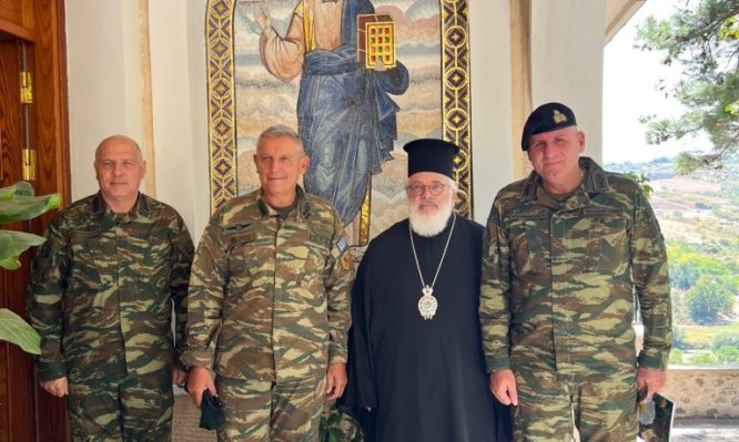 Τον Στρατηγό συνόδευαν ο Διοικητής του Δ΄ Σώματος Στρατού Αντιστράτηγος Δημόκριτος Κωνσταντάκος, ο Διοικητής της XVI Μεραρχίας Υποστράτηγος Κωνσταντίνος Καραμανίδης και επιτελικά στελέχη του ΓΕΕΘΑ. Μετά από μία γόνιμη συζήτηση για θέματα συνεργασίας των Ενόπλων Δυνάμεων και Εκκλησίας ο Σεβασμιώτατος προσέφερε εικόνα της Θεοτόκου με την ευχή η Υπέρμαχος Στρατηγός να προστατεύει και να καθοδηγεί τις Ένοπλες Δυνάμεις της Πατρίδας μας.