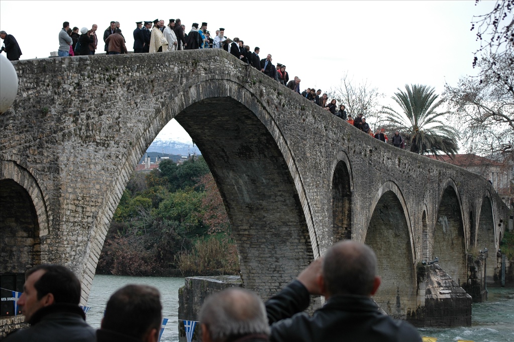 Από το ιστορικό γεφύρι της Άρτας πραγματοποιήθηκε χθες ο αγιασμός των υδάτων του ποταμού Αράχθου, ο οποίος διασχίζει την πόλη της Ηπείρου.