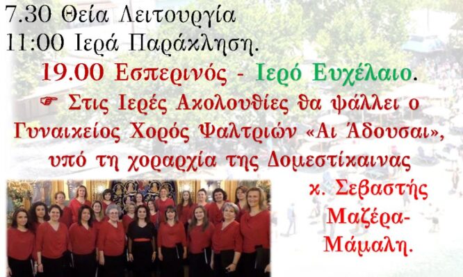 β) η τέλεση του Εσπερινού και του Μυστηρίου του Ιερού Ευχελαίου την Κυριακή 6/7 το απόγευμα στις 7.00 μ.μ., όπου στις Ιερές Ακολουθίες θα ψάλλει ο Γυναικείος Χορός Ψαλτριών «Αι Άδουσαι», υπό τη χοραρχία της Δομεστίκαινας κ. Σεβαστής Μαζέρα-Μάμαλη.