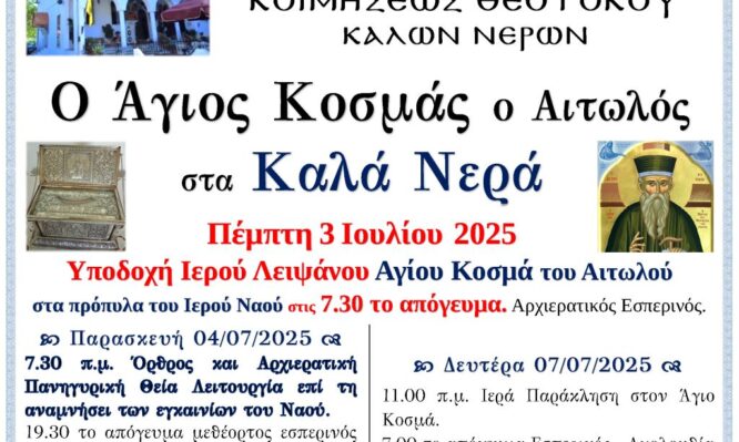 Τα Καλά Νερά και πιο συγκεκριμένα η ενορία του Ιερού Ναού Κοιμήσεως της Θεοτόκου Καλών Νερών, θα υποδεχθεί το Ιερό Λείψανο την Πέμπτη 3 Ιουλίου 2025 στις 7.30 το απόγευμα, στα πρόπυλα του Ναού. Θα ακολουθήσει Αρχιερατικός Εσπερινός.