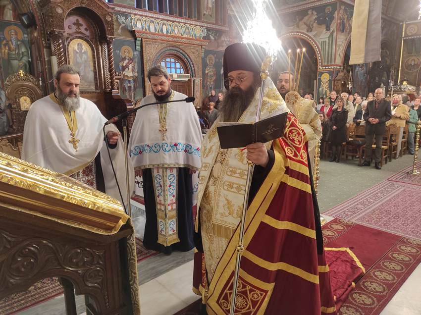 Τον Θείο λόγο εκήρυξε ο χοροστατών Επίσκοπος Κεγχρεών κ. Αγάπιος, ο οποίος λαβών αφορμή από την μνήμη του Ιωσήφ του Υμνογράφου (3ην Απριλίου ή κατά τον Κώδικα των Μηναίων των Παρισίων 4ην Απριλίου), Ποιητού του Κανόνος της Ακολουθίας του Ακαθίστου Ύμνου με ακροστιχίδα˙ «Χαρᾶς δοχεῖον, σοί πρέπει χαίρειν μόνη, Ἰωσήφ» αναφέρθηκε στο α’ τροπάριο της ε’ Ωδής∙ «Ὁδόν ἡ κυήσασα ζωῆς, χαῖρε Πανάμωμε, ἡ κατακλυσμοῦ τῆς ἁμαρτίας, σώσασα κόσμον …». Όπως η Κιβωτός διέσωσε «εν ημέραις Νώε» οκτώ ψυχές από τον κατακλυσμό κατά παρόμοιο τρόπο η Θεοτόκος, ως συνεργός της Ενανθρωπήσεως του Ιησού Χριστού, έσωσε τον κόσμο «εκ του κατακλυσμού της αμαρτίας». Η κατάσταση του κόσμου πριν τον κατακλυσμό ήταν, οι άνθρωποι ν᾽ αναπτύσσουν μεγάλη δραστηριότητα για να κάμνουν τον κόσμο τόπο άνετης και ευχάριστης παραμονής∙ δεν εσκέπτοντο όμως να τον κάμνουν τόπον άξιον Θεού, γι᾽ αυτό και η Αγία Γραφή αναφέρει∙ «καὶ εἶπε Κύριος ὁ Θεός· οὐ μὴ καταμείνῃ τὸ πνεῦμά μου ἐν τοῖς ἀνθρώποις τούτοις εἰς τὸν αἰῶνα διὰ τὸ εἶναι αὐτοὺς σάρκας» (Γεν. στ’,3). Αλλά και σήμερα ο άνθρωπος καταγίνεται να «εὐθύνῃ» τον δρόμο της ανθρώπινης ζωής, να τον κάνει ανετώτερο∙ δεν κάμνει όμως «εὐθείας τὰς τρίβους τοῦ Θεοῦ ἡμῶν» για να ̉δει «πᾶσα σάρξ τὸ σωτήριον τοῦ Θεοῦ» (πρβλ. Ησ. μ’, 3. 5). Όπως τότε η Κιβωτός έσωσε την εκ Θεού δημιουργία έτσι και στους μετά Χριστόν χρόνους η Εκκλησία, ως άλλη Κιβωτός, σώζει τους ανθρώπους, που δια του Βαπτίσματος, εισέρχονται σ᾽ Αυτήν. Η Εκκλησία, ως θεραπευτήριο (ιατρείο), δέχεται τους σ᾽ αυτήν εισερχόμενους όπως ο Νώε εισέρχεται στην Κιβωτό μαζί με τον Χαμ, που αποδείχθηκε μετά τον κατακλυσμό ανευλαβής και άσεμνος, αλλά και όπως ο κόρακας – σύμβολο του ακάθαρτου ανθρώπου που αρέσκεται να τρέφεται με την ακαθαρσία της αμαρτίας και γι᾽ αυτό «δραπετεύει» από την Εκκλησία – , με την περιστερά – σύμβολο της αγνής ψυχής που επιστρέφει, διότι αναπαύεται μόνο μέσα στην κιβωτό κατά το Ψαλμικό˙ «ἐπίστρεψον, ψυχή μου, εἰς τὴν ἀνάπαυσίν σου, ὅτι Κύριος εὐηργέτησέ σε, ὅτι ἐξείλετο τὴν ψυχήν μου ἐκ θανάτου» (ριδ.΄, 7-8) -, χωρίς να παραβιάζει την ελεύθερη βούληση του κάθε μέλους Της! Δυνάμει σεσωσμένος ο άνθρωπος εντός της «Κιβωτού», της Εκκλησίας, που η Θεοτόκος «οδόν ζωής κυήσασα» τον Χριστό, έδωσε την δυνατότητα στον καθ᾽ ένα μας ν᾽ αξιοποιήσει την ελευθερία του. Γι᾽ αυτό και παρεκάλεσε τον Σεβασμιώτατο Μητροπολίτη μας κ. Διονύσιο να εύχεται, ώστε όλοι μας να είμαστε σαν την περιστερά που επέστεψε στην Κιβωτό και όχι σαν τον κόρακα που δραπέτευσε απ᾽ αυτήν.