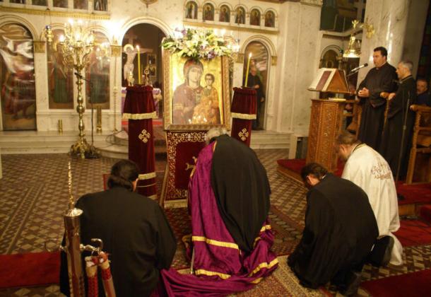 στην Ακολουθία του Ακαθίστου Ύμνου. Σε έναν κατάμεστο από πιστούς Ιερό Ναό, ο Σεβασμιώτατος έψαλλε τους Χαιρετισμούς της Θεοτόκου, μπροστά στη θαυματουργή εικόνα της Παναγίας της Γραμμουστιανής, ενώ στο λόγο του αναφέρθηκε στην Μητέρα του Κυρίου μας Ιησού Χριστού αλλά και στον τρόπο ζωής που πρέπει να ακολουθούμε εμείς σήμερα ως χριστιανοί.