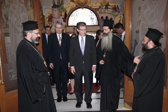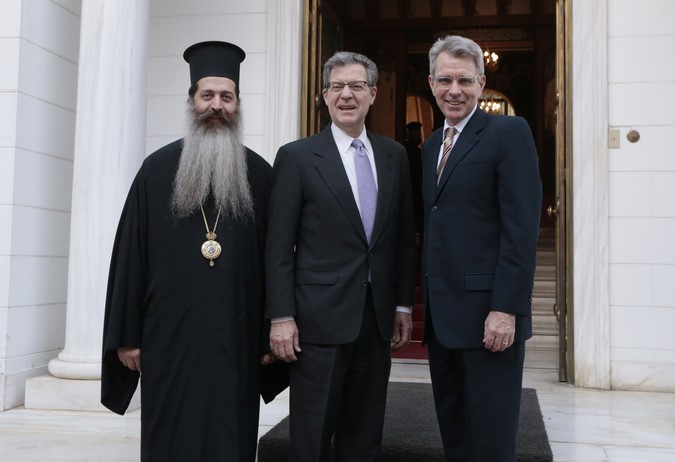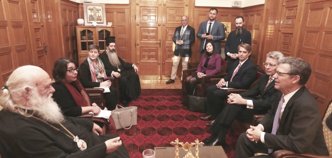 Τον κ. Brownback και τους συνεργάτες του υποδέχθηκε στην είσοδο της Αρχιεπισκοπής ο Πρωτοσύγγελλος Επίσκοπος Θεσπιών κ. Συμεών.