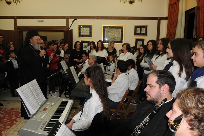 Το απόγευμα της κυριωνύμου ημέρας, ο Σεβασμιώτατος Μητροπολίτης δέχθηκε τις ευχές των Αρχών και του Λαού στην Αίθουσα του Θρόνου της Ιεράς Μητροπόλεως, κάτω από την όμορφη μελωδία των παιδιών της Χορωδίας – Ορχήστρας Νέων της Ιεράς Μητροπόλεως, υπό την διεύθυνση του μουσικού κ. Παυλου Κουρμπέτη, τα οποία με πολλή αγάπη προσήλθαν στην γιορτή του πνευματικού τους πατέρα και τραγούδησαν εξαιρετικά γνωστά τραγούδια της πλούσιας ελληνικής μουσικής.