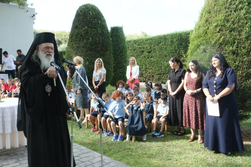 Ο Αρχιεπίσκοπος τόνισε ότι η σημερινή μέρα είναι ιδιαιτέρως συγκινητική διότι τα παιδιά αρχίζουν μια νέα προσπάθεια για έναν καινούργιο χρόνο μαθητείας. «Βέβαια, η μαθητεία στον άνθρωπο δεν τελειώνει ποτέ, αλλά η συγκεκριμένη παίζει σπουδαίο ρόλο στην ζωή όχι μόνο των παιδιών και της οικογένειας που μεγαλώνουν, αλλά της κοινωνίας ολόκληρης» σημείωσε ο Αρχιεπίσκοπος και προσέθεσε: «Βλέποντας τις συνθήκες της ζωής, διακρίνουμε τα υπέροχα εφευρήματα και τις επιτυχίες της εποχής, αλλά βλέπουμε ότι παρουσιάζονται και δυσκολίες σε όλη την κοινωνία. Σε αυτές τις δυσκολίες πάντοτε η Εκκλησία και η Πολιτεία προσπαθούν να βοηθήσουν. Αλλά σε αυτό το θέμα υπάρχουν πολλές παρεξηγήσεις και δυσκολίες. Ο καθένας βλέπει την πρόοδο με το δικό του βλέμμα. Άλλοτε έχουμε εκδηλώσεις που χαιρόμαστε και χειροκροτούμε κι άλλοτε γεγονότα που μας λυπούν». Ο Αρχιεπίσκοπος υπογράμμισε, ότι όλοι οι θεσμοί προσπαθούν, ώστε να ξεπεραστούν αυτά τα προβλήματα. «Υπάρχει όμως και ένας άλλος τρόπος, για να λυθούν τα προβλήματα, αλλιώτικος, περιφρονημένος κάποιες φορές. Πρόκειται για την διδασκαλία, τα βιώματα της Εκκλησίας, δηλαδή το νόημα της ζωής, όπως μας το παρουσίασε ο Ιησούς Χριστός. Η πείρα, η πορεία της ζωής, έδειξε ότι αυτοί που ακολούθησαν τα διδάγματα αυτής της διδασκαλίας δεν έχουν πέσει έξω. Είναι η ελπίδα μας. Είναι αυτό που θέλουμε και επιθυμούμε όλοι. Δηλαδή αυτούς που αγαπάμε να τους δείξουμε τον ίσιο δρόμο. Γίνονται και λάθη, αλλά η διδασκαλία αυτό μας δείχνει, ότι διορθώνονται τα λάθη. Σκοπός αυτού του σχολείου, λοιπόν, είναι να δείξουμε σε αυτά τα παιδιά τον σωστό δρόμο». Ευχαρίστησε τους γονείς για την εμπιστοσύνη και την συνεργασία, τους εκπαιδευτικούς, οι οποίοι είναι το στήριγμα αυτής της πορείας, αλλά και την Διευθύντρια κ. Κατερίνα Ράπτη, καθώς και όλους τους συνεργάτες για την πολύτιμη συμβολή τους. Παράλληλα, εξήρε τη συμβολή του Βαφειαδάκειου Ιδρύματος για το έργο που επιτελεί, ενώ ολοκληρώνοντας την ομιλία του ανακοίνωσε ότι η Αρχιεπισκοπή ετοιμάζει στην περιοχή ένα πρότυπο κέντρο Αλτσχάιμερ.
