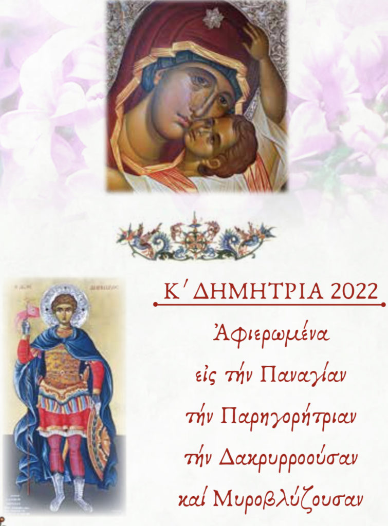 Θα προηγηθεί ο Εσπερινός και η Ιερά Παράκληση στην Παναγία την Παρηγορήτρια και τον Άγιο Δημήτριο.
