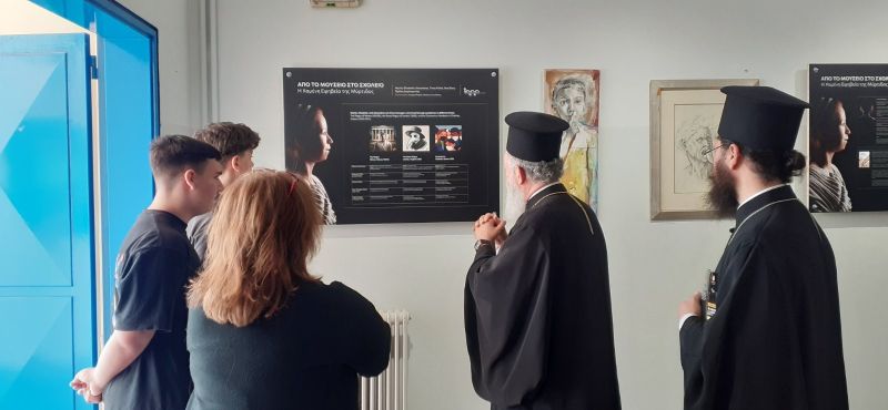 Κατόπιν, μαθητές και μαθήτριες ξενάγησαν τον Σεβασμιώτατο στην έκθεση που είχαν δημιουργήσει πάνω στην ιστορία της νεαρής Μύρτιδας.