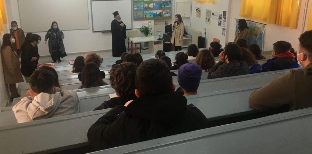 Ο Σεβασμιώτατος συναντήθηκε με τους μαθητές και τις μαθήτριες στο αμφιθέατρο του Σχολείου και συζήτησε μαζί τους σχετικά με θέματα βελτίωσης των ανθρωπίνων σχέσεων, τον κοινωνικό αποκλεισμό και τον σεβασμό μεταξύ των μελών της σχολικής κοινότητας και της κοινωνίας ευρύτερα.