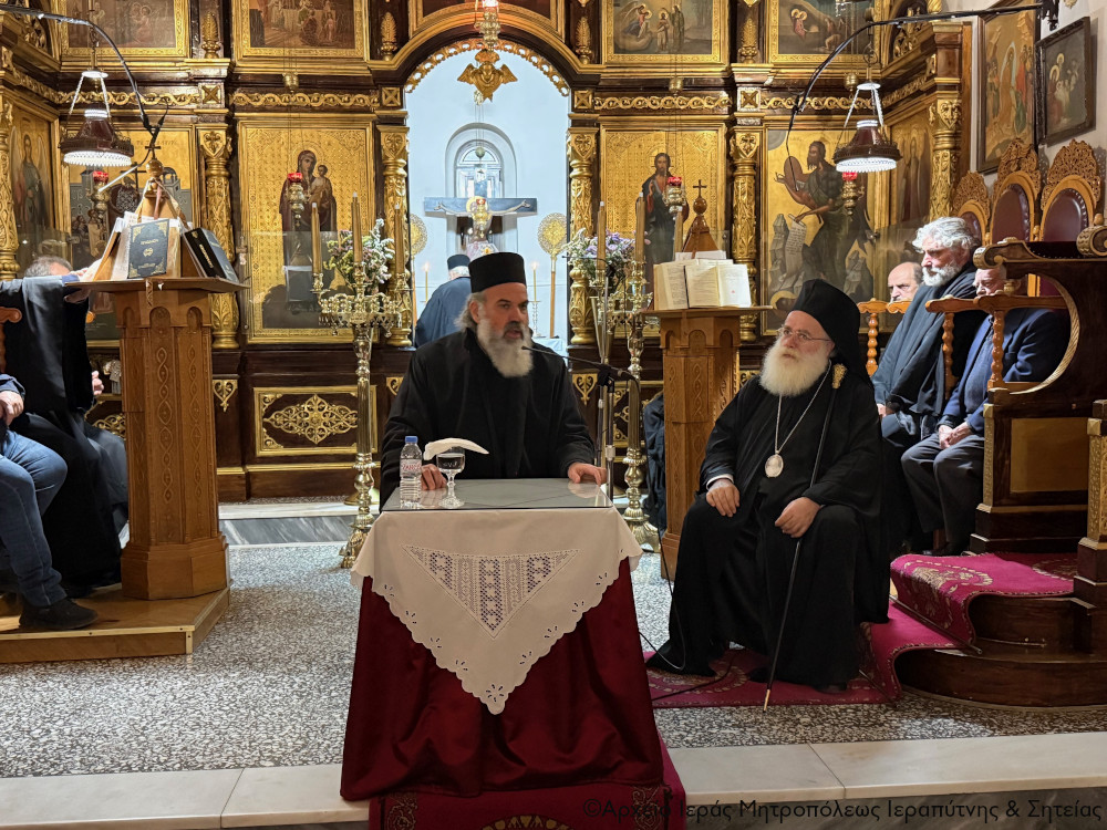 Ακολούθησε επίκαιρη ομιλία από τον Πανοσιολ. Αρχιμ. π. Δημήτριο Στρατή, κληρικό της Ι. Μητροπόλεως Κηφισίας, Αμαρουσίου και Ωρωπού, και Αν. Καθηγητή της Πατριαρχικής Ανωτάτης Εκκλησιαστικής Ακαδημίας Κρήτης, ο οποίος ανέπτυξε το θέμα: «Ο Σταυρός όπλο κατά των πειρασμών στο μεσοπέλαγο της Μεγάλης Τεσσαρακοστής».