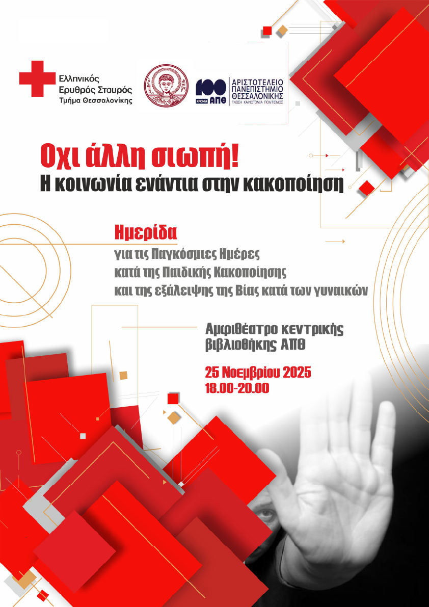 Με αφορμή τον διπλό συμβολισμό του Νοεμβρίου, έναν μήνα στον οποίο εμπεριέχονται τόσο η Παγκόσμια Ημέρα κατά της Παιδικής Κακοποίησης (19 του μηνός), όσο και η Παγκόσμια Ημέρα για την Εξάλειψη της Βίας κατά των Γυναικών (25 του μηνός), το Περιφερειακό Τμήμα του Ελληνικού Ερυθρού Σταυρού Θεσσαλονίκης διοργανώνει την Τρίτη 25 Νοεμβρίου, στις 6 το απόγευμα, στο Αμφιθέατρο της Κεντρικής Βιβλιοθήκης του ΑΠΘ ημερίδα με τίτλο: «Όχι άλλη σιωπή: Η κοινωνία ενάντια στην κακοποίηση». Συντονιστής της ημερίδας θα είναι ο καθηγητής της Νομικής σχολής του Δημοκρίτειου Πανεπιστημίου Θράκης και αντιπρόεδρος του Δικηγορικού Συλλόγου Θεσσαλονίκης Παναγιώτης Γιαννόπουλος.