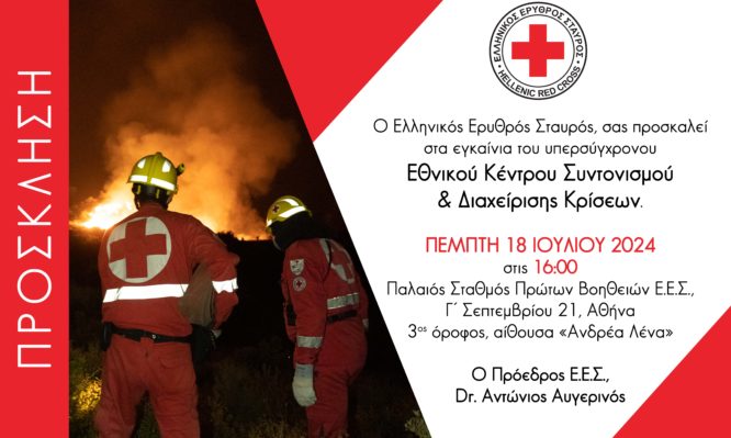 Ο Ελληνικός Ερυθρός Σταυρός (Ε.Ε.Σ.), την Πέμπτη 18 Ιουλίου και ώρα 4 μ.μ.,εγκαινιάζει το υπερσύγχρονοΕθνικό Κέντρο Συντονισμού και Διαχείρισης Κρίσεων του Ε.Ε.Σ., το οποίο στεγάζεται στο ιστορικό κτήριο του Ε.Ε.Σ. στην 3ης Σεπτεμβρίου (αριθμός 21). Ένααποφασιστικό βήμα για την ενίσχυση της ικανότητας του Ε.Ε.Σ. να ανταποκρίνεται άμεσα και αποτελεσματικά σε καταστάσεις έκτακτης ανάγκης (πυρκαγιές, πλημμύρες, σεισμοί κ.α.), καθώς είναι εξοπλισμένο με σύγχρονες υποδομές και τεχνολογίες αιχμής.
