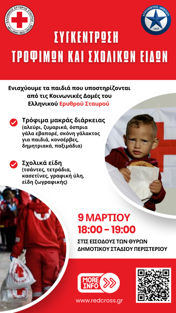 Ο Ελληνικός Ερυθρός Σταυρός (Ε.Ε.Σ.) και η ΠΑΕ Ατρόμητος, με αφορμή την Παγκόσμια Ημέρα κατά του σχολικού εκφοβισμού (bullying), διοργανώνουν μεγάλη δράση ενημέρωσης και ευαισθητοποίησης για ένα τόσο σοβαρό κοινωνικό ζήτημα αλλά και αλληλεγγύης για τα 213 παιδιά που υποστηρίζονται από τις κοινωνικές δομές του Ε.Ε.Σ., στον αγώνα του Ατρομήτου με τον Παναθηναϊκό, την Κυριακή 9 Μαρτίου 2025 και ώρα 19:00 στο Δημοτικό Στάδιο Περιστερίου.