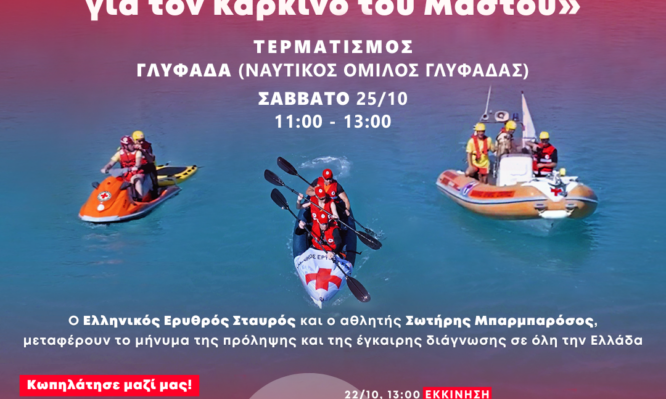 Ο Ελληνικός Ερυθρός Σταυρός διοργανώνει το Σάββατο (25/10) και ώρες 11:00 έως 13:00, στον Ναυτικό Όμιλο Γλυφάδας (Διαδόχου Παύλου 42), μεγάλη εκδήλωση ενημέρωσης, ευαισθητοποίησης και πρόληψης για τον καρκίνο του μαστού, η οποία θα συνδυαστεί με τον τερματισμό της μεγάλη εκστρατείας που διοργανώνει ο Ε.Ε.Σ. με τον αθλητή μεγάλων αποστάσεων, Σωτήρη Μπαρμπαρόσο, ο οποίος, έχοντας στο πλευρό του ανεμόπτερο, ναυαγοσωστική λέμβο και διασωστικό jet ski του Ελληνικού Ερυθρού Σταυρού, θα κωπηλατήσει με κανό περίπου 110 ναυτικά μίλια από την Πάτρα (22/10) έως την Αθήνα (25/10), με ενδιάμεσες στάσεις σε Ναύπακτο (22/10), Ξυλόκαστρο (23/10) και Λουτράκι (24/10), μεταφέροντας ένα μήνυμα ελπίδας, δύναμης και πρόληψης για τον καρκίνο του μαστού.