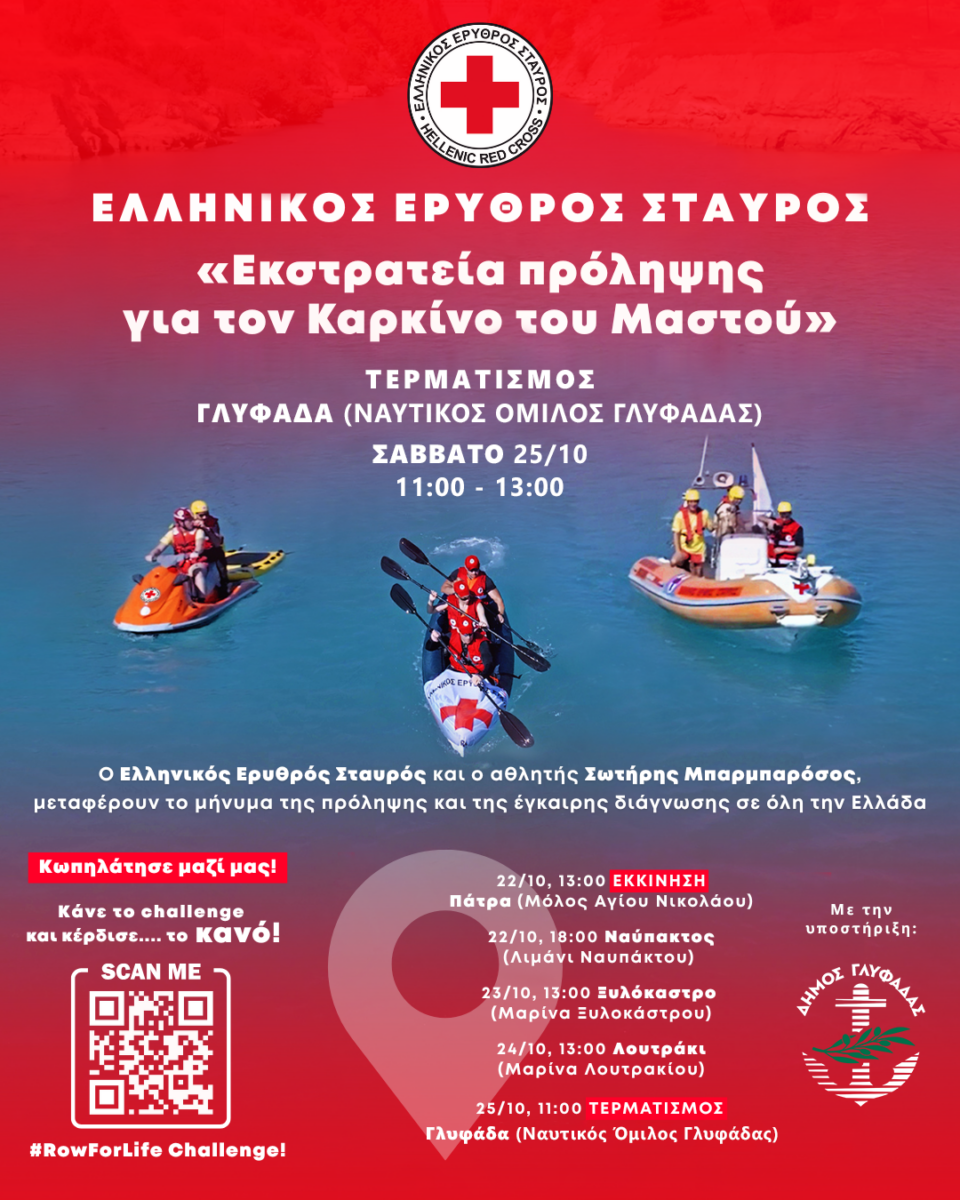 Ο Ελληνικός Ερυθρός Σταυρός διοργανώνει το Σάββατο (25/10) και ώρες 11:00 έως 13:00, στον Ναυτικό Όμιλο Γλυφάδας (Διαδόχου Παύλου 42), μεγάλη εκδήλωση ενημέρωσης, ευαισθητοποίησης και πρόληψης για τον καρκίνο του μαστού, η οποία θα συνδυαστεί με τον τερματισμό της μεγάλη εκστρατείας που διοργανώνει ο Ε.Ε.Σ. με τον αθλητή μεγάλων αποστάσεων, Σωτήρη Μπαρμπαρόσο, ο οποίος, έχοντας στο πλευρό του ανεμόπτερο, ναυαγοσωστική λέμβο και διασωστικό jet ski  του Ελληνικού Ερυθρού Σταυρού, θα κωπηλατήσει με κανό περίπου 110 ναυτικά μίλια από την Πάτρα (22/10) έως την Αθήνα (25/10), με ενδιάμεσες στάσεις σε Ναύπακτο (22/10), Ξυλόκαστρο (23/10) και Λουτράκι (24/10), μεταφέροντας ένα μήνυμα ελπίδας, δύναμης και πρόληψης για τον καρκίνο του μαστού.