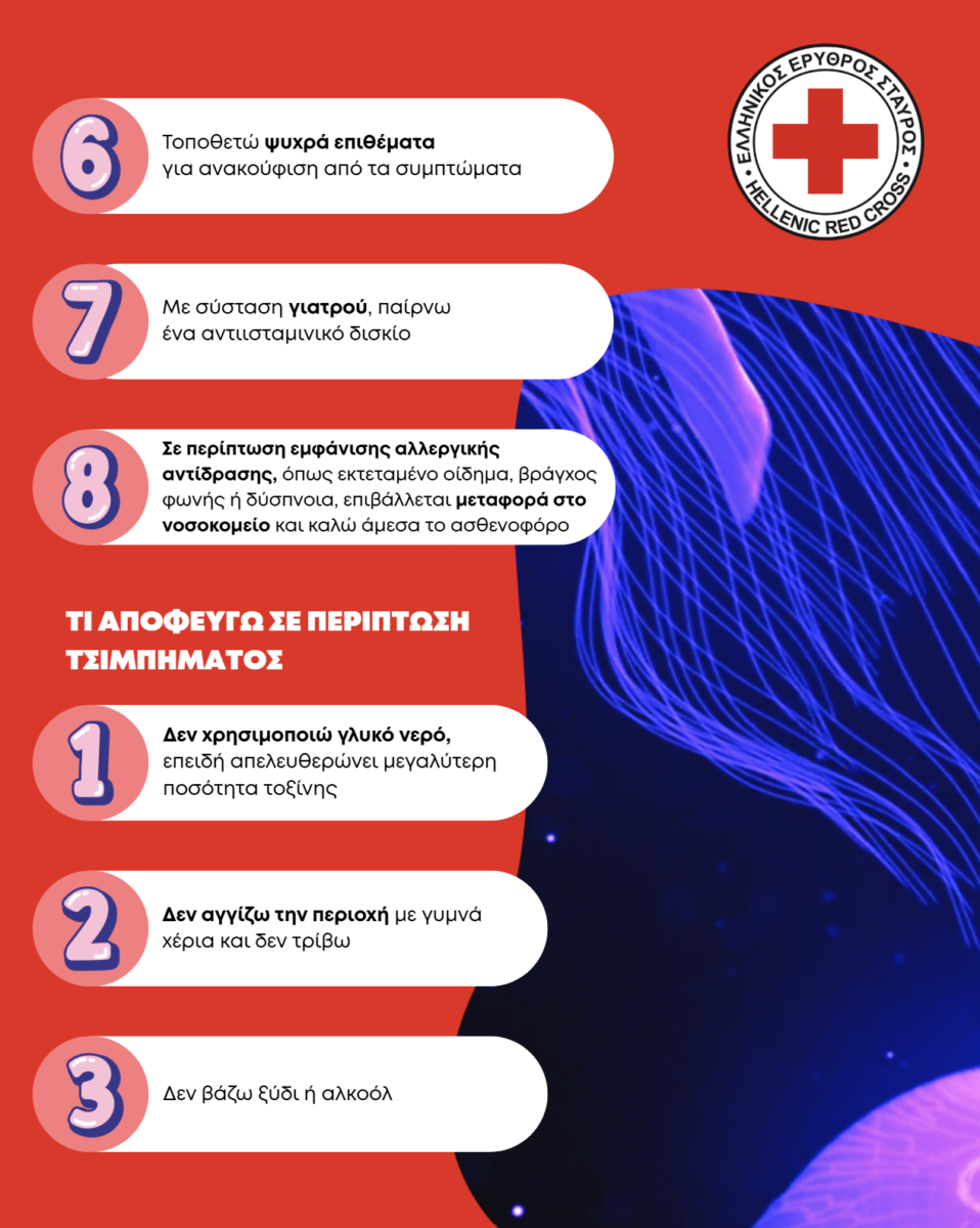 Ο Ελληνικός Ερυθρός Σταυρός, στο πλαίσιο της προστασίας της δημόσιας υγείας και της ασφάλειας των πολιτών, ενημερώνει για τα ενδεδειγμένα μέτρα αντιμετώπισης τσιμπήματος από μωβ μέδουσα, ένα φαινόμενο που παρουσιάζει αυξητική τάση στις ελληνικές θάλασσες κατά τους θερινούς μήνες.