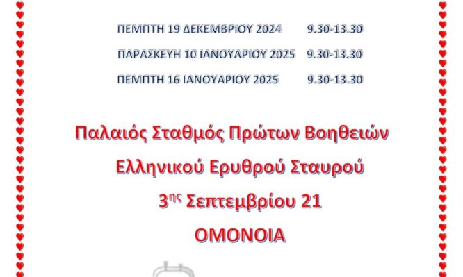 Ο Ελληνικός Ερυθρός Σταυρός (Ε.Ε.Σ.), σε συνεργασία με το Υπουργείο Υγείας, διοργανώνει τρεις εθελοντικές αιμοδοσίες το επόμενο διάστημα (19/12, 10/1 και 16/1), με σκοπό την ενίσχυση των εθνικών αποθεμάτων αίματος και την προώθηση της αλληλεγγύης προς τους συνανθρώπους μας που έχουν ανάγκη. Συγκεκριμένα, οι αιμοδοσίες θα πραγματοποιηθούν στον Παλαιό Σταθμό Πρώτων Βοηθειών του Ελληνικού Ερυθρού […]