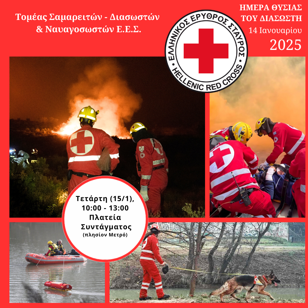 O Ελληνικός Ερυθρός Σταυρός (Ε.Ε.Σ.) τιμά την Ημέρα Θυσίας του Διασώστη (14 Ιανουαρίου), διοργανώνοντας μεγάλη εκδήλωση στην Πλατεία Συντάγματος (πλησίον του Μετρό), την Τετάρτη 15 Ιανουαρίου 2025 και ώρες 10:00 – 13:00.