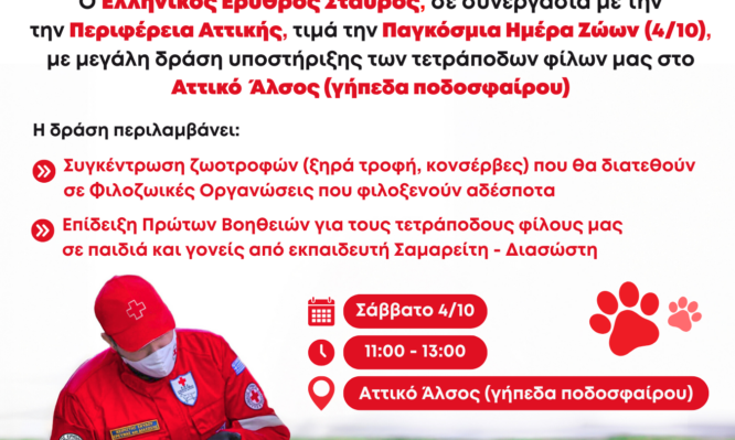 Ο Ελληνικός Ερυθρός Σταυρός (Ε.Ε.Σ.), με αφορμή την Παγκόσμια Ημέρα Ζώων (4/10), διοργανώνει, μεγάλη δράση υποστήριξης των τετράποδων φίλων μας, το Σάββατο (4/10), στο Αττικό Άλσος (γήπεδα ποδοσφαίρου), από τις 11:00 έως τις 13:00. Η δράση τελεί υπό την αιγίδα της Περιφέρειας Αττικής.
