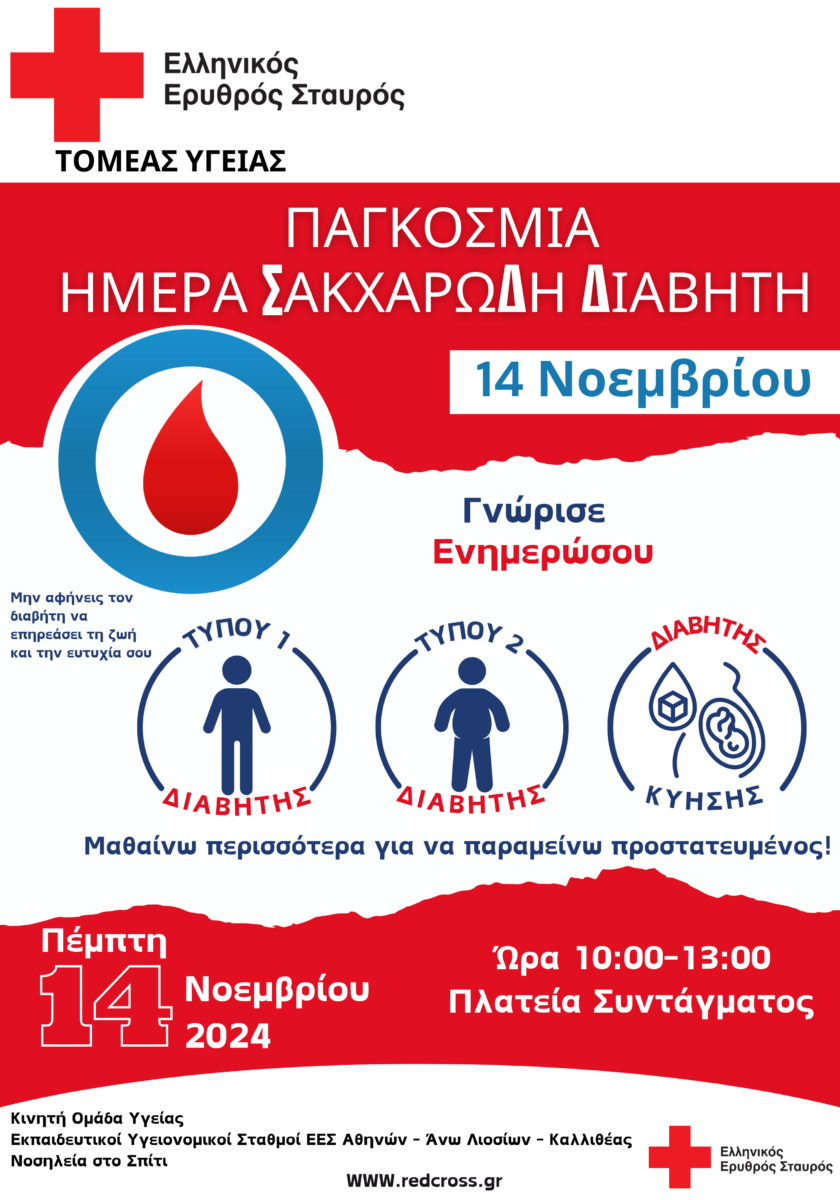 Ο Ελληνικός Ερυθρός Σταυρός (ΕΕΣ) με αφορμή την Παγκόσμια Ημέρα Σακχαρώδη Διαβήτη που εορτάζεται την 14η Νοεμβρίου κάθε έτους, όπως έχει καθιερωθεί από τον Παγκόσμιο Οργανισμό Υγείας και τη Διεθνή Ομοσπονδία Διαβήτη, υλοποιεί συντονισμένη δράση ενημέρωσης και ευαισθητοποίησης σχετικά με το Διαβήτη, καθώς η γνώση και η έγκυρη πληροφόρηση, είναι δύναμη.