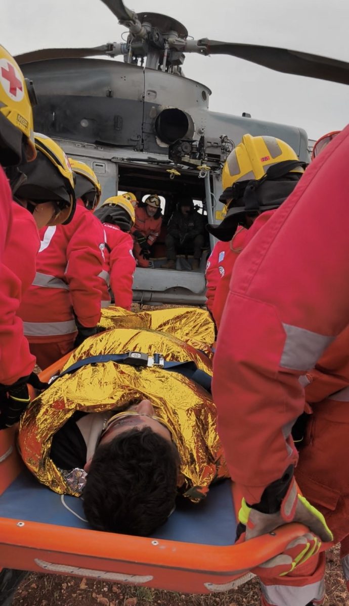 Επίσης, υλοποιήθηκε σενάριο ορεινής διάσωσης και μεταφοράς πολυτραυματία ορειβάτη από ιδιαίτερα δύσβατο σημείο στην περιοχή Σκούρτα. Κλιμάκιο εθελοντών Σαμαρειτών – Διασωστών & Ναυαγοσωστών του Ελληνικού Ερυθρού Σταυρού επιχείρησε με ακρίβεια και ταχύτητα, ενώ η αεροδιακομιδή του τραυματία πραγματοποιήθηκε με ελικόπτερο Super Puma της Πολεμικής Αεροπορίας, επιβεβαιώνοντας την άριστη συνεργασία των εμπλεκόμενων φορέων.