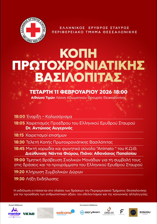 Tην ετήσια εκδήλωση κοπής της πρωτοχρονιάτικης βασιλόπιτας θα πραγματοποιήσει το Περιφερειακό Τμήμα Θεσσαλονίκης του Ελληνικού Ερυθρού Σταυρού την Τετάρτη 11 Φεβρουαρίου, στις 6 το απόγευμα, στην Αίθουσα Τιμών της Λέσχης Αξιωματικών Φρουράς Θεσσαλονίκης, στην οδό Εθνικής Αμύνης 1, παρουσία του Προέδρου του Ε.Ε.Σ. Dr. Αντώνιου Αυγερινού.