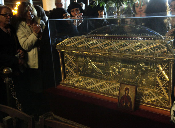 Τὸ ἅγιο σκήνωμά της θάφτηκε στὸ μοναστηράκι τῆς Καλογρέζας κι᾿ ἀπὸ κεῖ ἔγινε ἡ ἀνακομιδὴ τῶν λειψάνων στὴν ἐκκλησιὰ τοῦ ἁγίου Ἀνδρέα ποὺ βρίσκεται στὴ σημερινὴ Ἀρχιεπισκοπή. Μετὰ πολλὰ χρόνια, ἐπειδὴ αὐτὴ ἡ ἐκκλησιὰ κόντευε νὰ γκρεμνισθεῖ, τὸ πήγανε στὸν ἅγιο Ἐλευθέριο κι᾿ ἀπὸ κεῖ στὴ σημερινὴ μητρόπολη, μέσα στ᾿ ἅγιο βῆμα. Στὸ μνῆμα της ἀπάνω βρεθήκανε γραμμένα τοῦτα τὰ λόγια:
