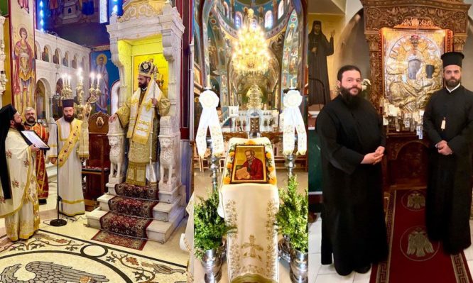 Ο π. Επιφάνιος προσέφερε ως ευλογία στον υψηλό προσκεκλημένο την Ιερά Εικόνα του Πολιούχου της Ιεράς Μητροπόλεως Αγίου Γεωργίου του Νεαπολίτου, για να τον στηρίζει και να τον ενισχύει στα νέα αρχιερατικά του καθήκοντα στην Ιερά Μητρόπολη Θυατείρων και Μεγάλης Βρετανίας.