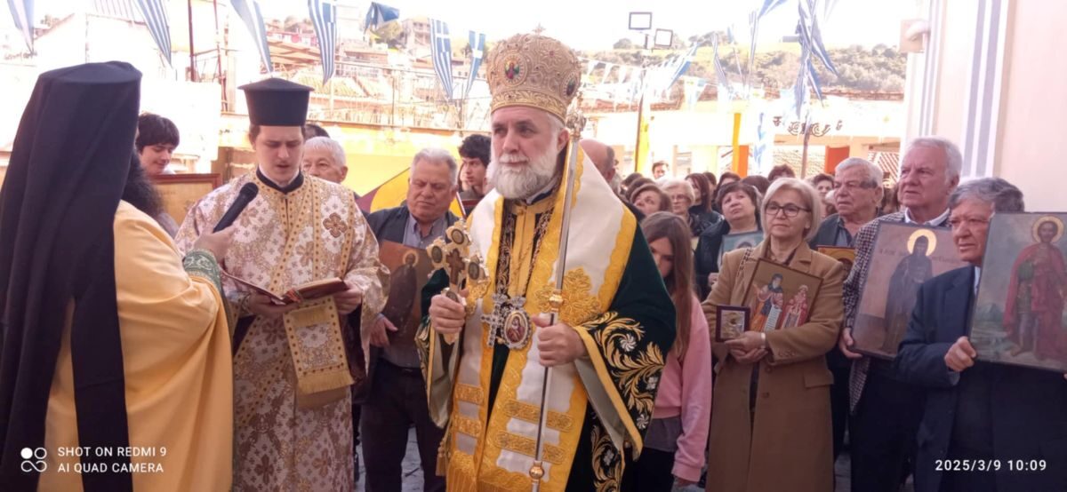 Στη Θεία Λειτουργία εκκλησιάσθηκαν και συμμετείχαν στο Κοινό Ποτήριο πολλοί χριστιανοί της κωμοπόλεως, οι οποίοι πλαισίωσαν τον Θεοφιλέστατο και τους συλλειτουργούς του Κληρικούς κατά την ακολουθήσασα λιτάνευση των ιερών εικόνων εις ανάμνησιν της αναστηλώσεώς τους.
