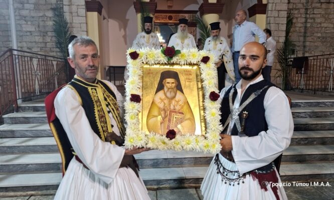 Ακολούθησε η λιτάνευση της Ιεράς Εικόνας και του Ιερού Λειψάνου του Αγίου στους δρόμους του χωριού.