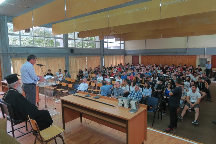 Τον Ποιμενάρχη Φθιώτιδος καλωσόρισε στην αίθουσα του Αμφιθεάτρου ο κ. Σγάγιας και αφού παρουσίασε στους μαθητές του ΟΑΕΔ και στους σπουδαστές του ΙΕΚ τον Σεβασμιώτατο, τον ευχαρίστησε θερμά για την ευγενική και τιμητική αποδοχή της προσκλήσεως αυτής και στην συνέχεια τον εκάλεσε εις το βήμα για να απευθύνει τον λόγο προς τα παριστάμενα παιδιά, τα οποία είχαν κατακλείσει το Αμφιθέατρο.