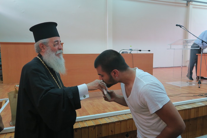 Στην συνέχεια ο Ποιμενάρχης μας έδωκε στον κ. Διευθυντή ως ευλογία μία εικόνα της Παναγίας και μια Καινή Διαθήκη των Εκδόσεων της Ιεράς Μητροπόλεως μας, ενώ σε όλα τα παιδιά μαζί με την πατρική του ευχή έδωκε και μία Καινή Διαθήκη.